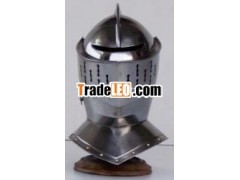European medieval close helmet.A classic knight''s helmet, most popular in 15th century jousts.These European close helmets have a eye slit and neck protector.The faceplate of these helmet features many breathing holes and canbe easily raised and lowere.